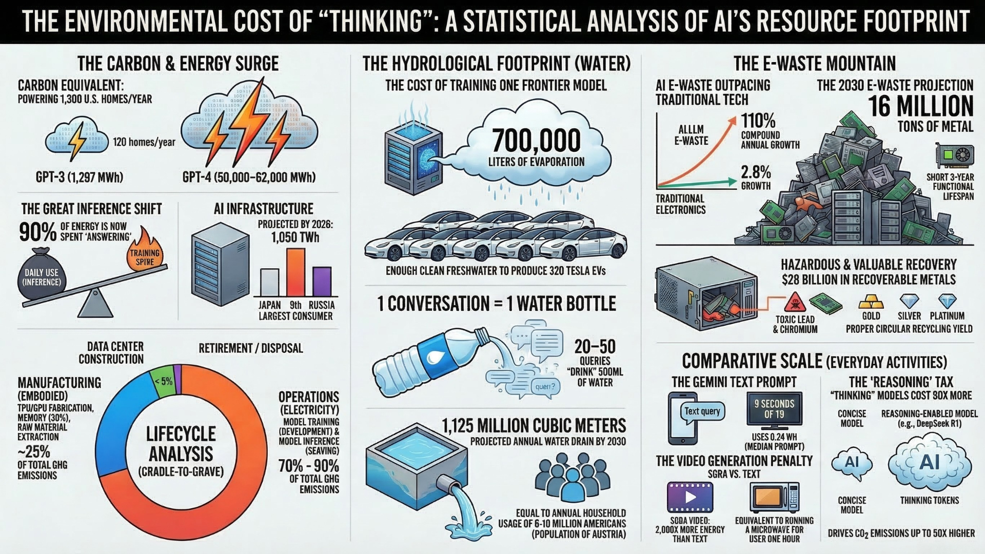 To understand the true environmental cost of the generative AI boom, we must examine the full lifecycle of these systems: from the energy and water consumed during model training and daily inference, to the embodied carbon of manufacturing specialized hardware.